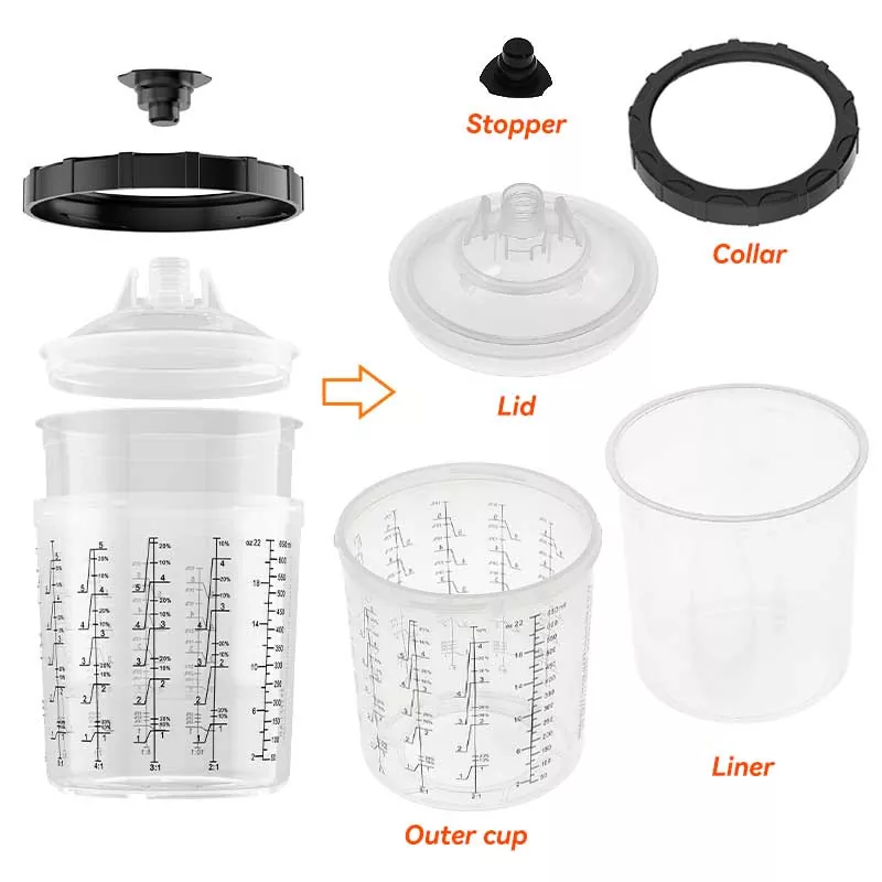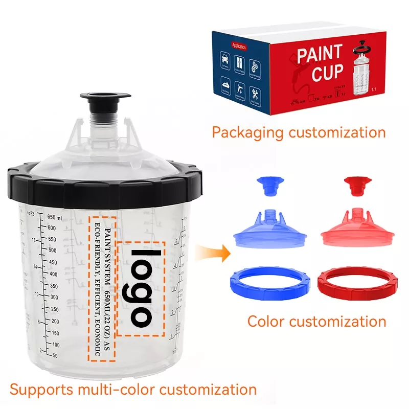 600 ml:n kertakäyttöinen maalikuppijärjestelmä 1.0 on monipuolisin vakiokuppi, joka sopii alueille, joissa ruiskutetaan enintään 22 fl unssia materiaalia. AYSPAT tarjoaa valikoiman erilaisia PPS-kuppijärjestelmiä, joista voit valita, ja ne voidaan myös räätälöidä tarpeidesi mukaan: Ulompi kuppi voidaan räätälöidä brändisi logolla ja skaalata, ja suodatin voidaan räätälöidä kannella. Olemme sitoutuneet kehittämään tehokkaampia ja kätevämpiä kertakäyttöisiä ruiskukuppijärjestelmiä, jotka auttavat maalareita suorittamaan maalaustyönsä ammattimaisesti ja tehokkaasti.