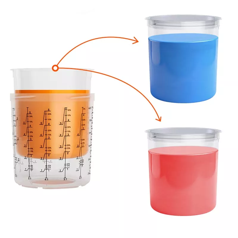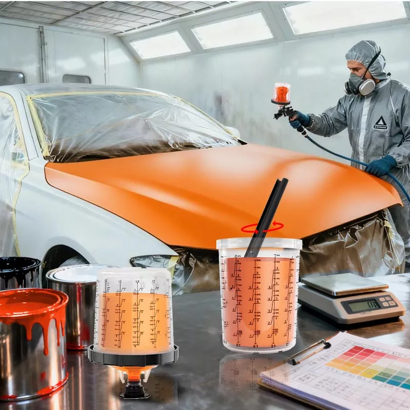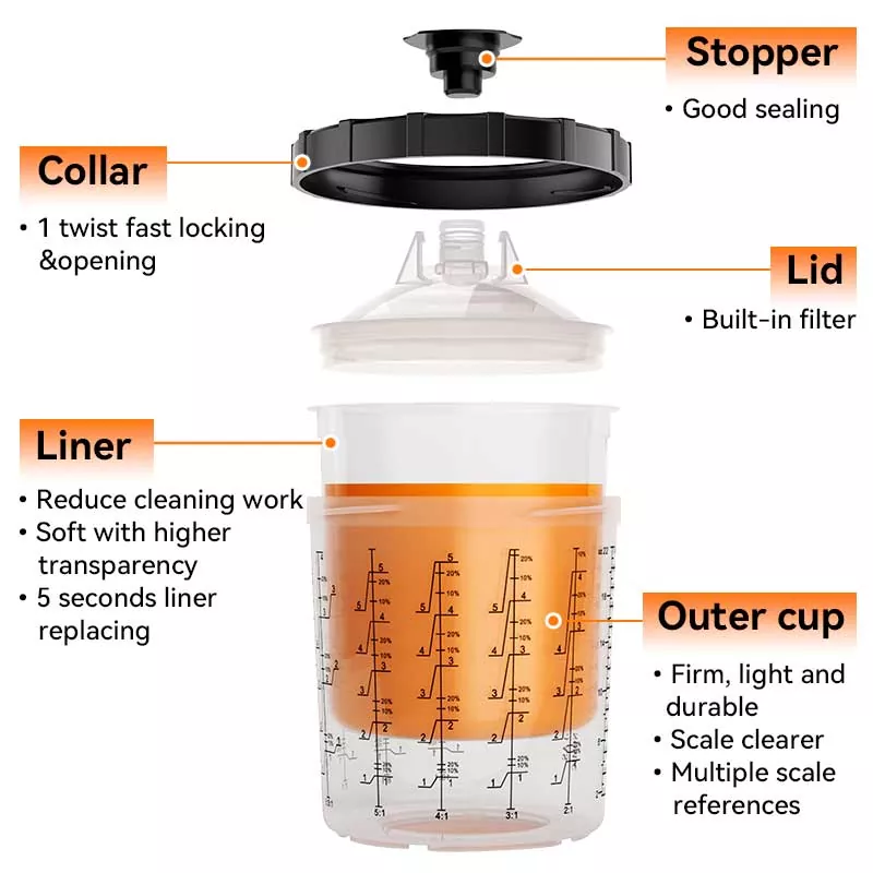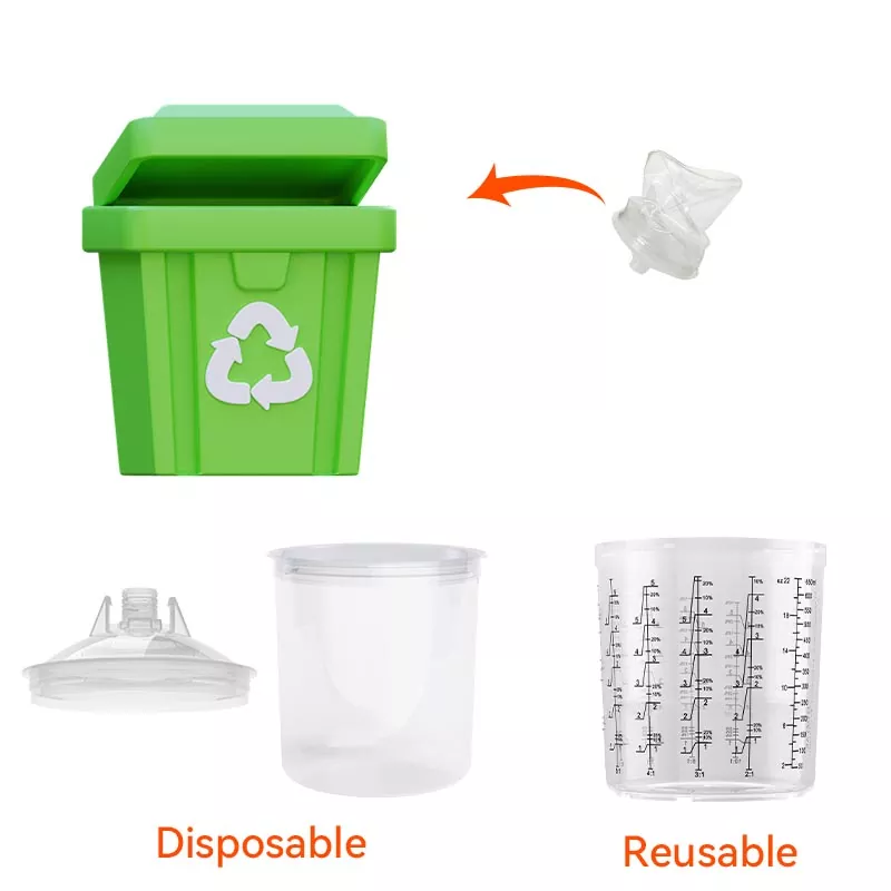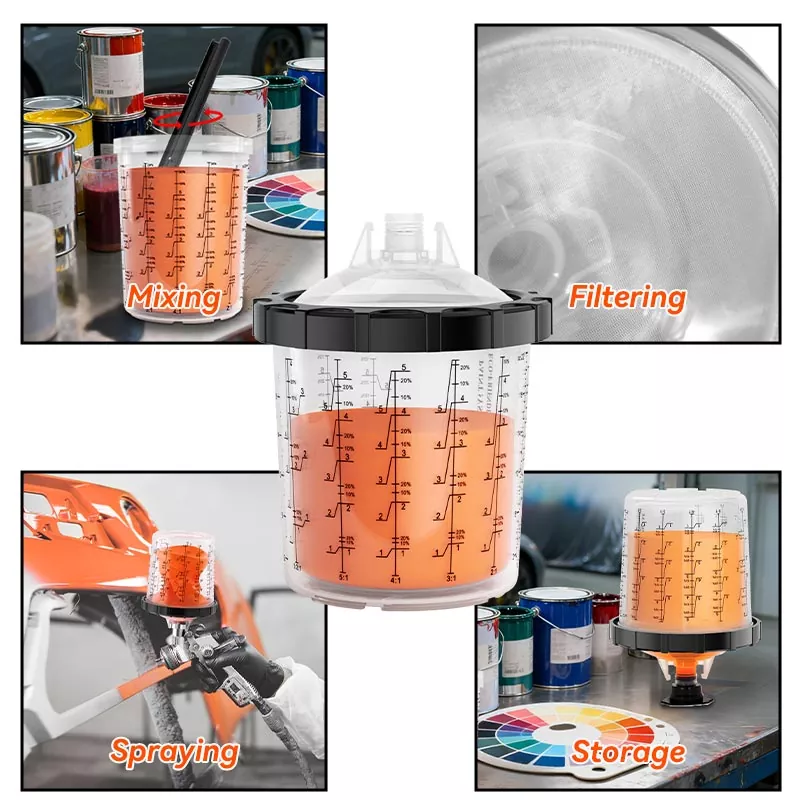 Kertakäyttöinen maalikuppijärjestelmä yhdistää sekoitus-, suodatus-, ruiskutus- ja säilytystoiminnot yhdessä yksikössä. Tämä paitsi yksinkertaistaa esimaalausta, myös säästää sekoituskuppien ja paperisuppiloiden kustannuksia, mikä tekee niistä täydellisen valinnan säästääksesi valmisteluaikaa ja parantamalla ruiskutuksen tehokkuutta.