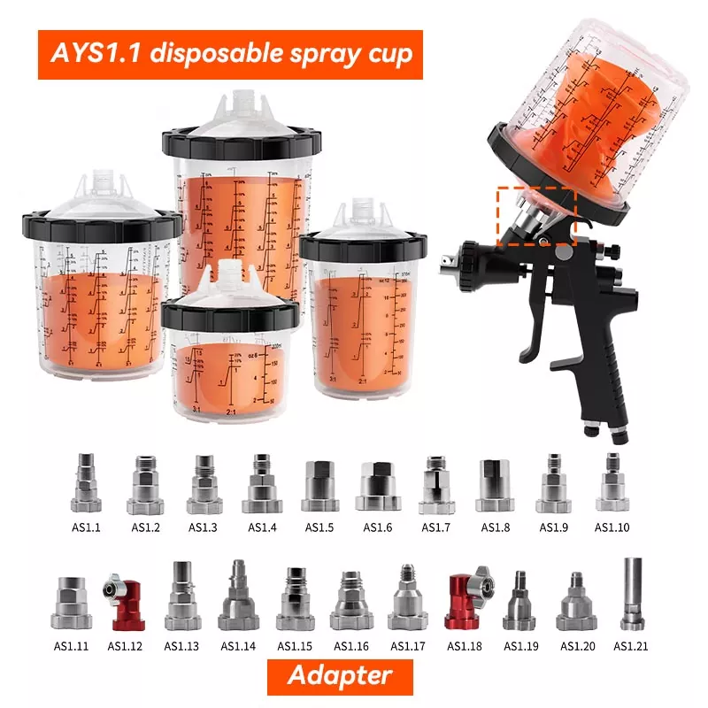 AYS1.1 kertakäyttöinen suihkekuppi on yhteensopiva PPS1.0-sarjan sovittimen kanssa. Adapterin avulla se voidaan sovittaa täydellisesti minkä tahansa merkkiseen ruiskupistooliin ja sitä voidaan käyttää missä tahansa asennossa ilman maalin tippumisen riskiä.