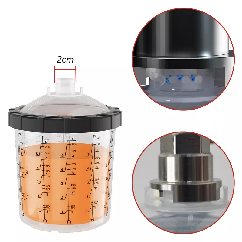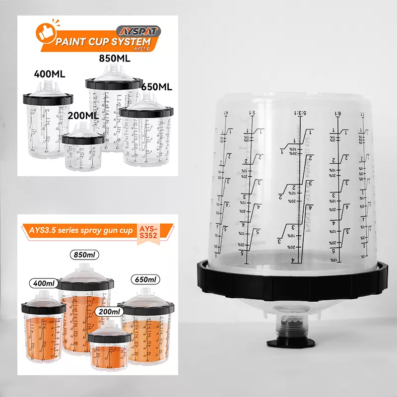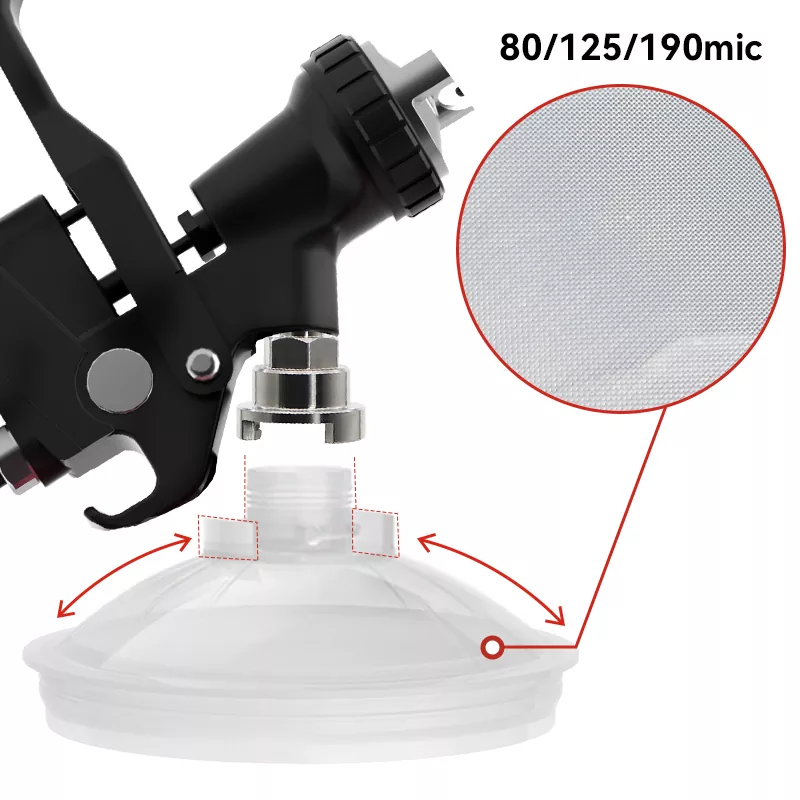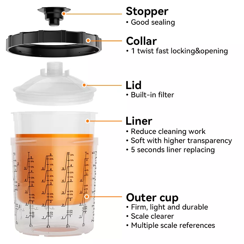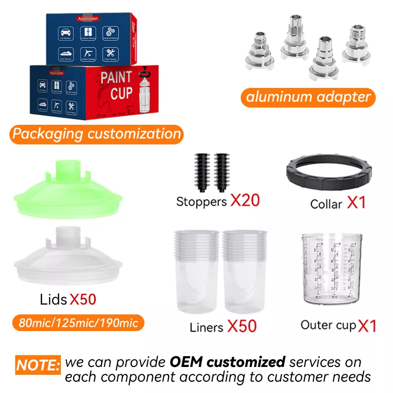 650ML Speedy Paint System 2.0 on uudenlainen kertakäyttöinen spraymaalikuppijärjestelmä. Yksi laatikko sisältää [1 ulompi kuppi + 1 kaulus + 50 sisäosaa + 50 kantta + 20 tulppaa], joka tukee useita värivärejä yhdellä sovelluksella. Erilaisia maalin hiukkaskokoja varten on saatavilla suodatinverkkoja 80, 125 ja 190 mikrometrin kokoisina, joten voit valita sopivan suodattimen. Kertakäyttöinen spraymaalauskuppijärjestelmä voi toimia myös maalin sekoitus- ja säilytysyksikkönä, joten paperisuppiloita ja sekoituskuppeja ei enää tarvitse käyttää, sillä saavutetaan neljä toimintoa yhdessä: suodatus, sekoitus, ruiskutus ja maalin varastointi. Tästä syystä maalauksen harrastajat rakastavat tätä tuotetta niin paljon.
